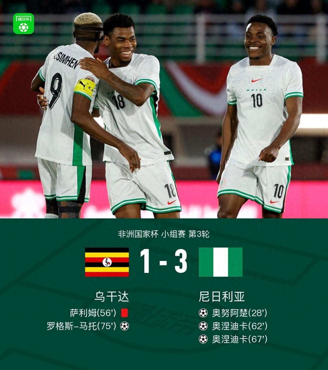 尼日利亞3-1十人烏干達全勝頭名出線+送對手出局,奧涅迪卡雙響