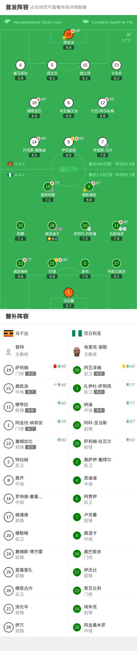 北京時間12月31日非洲國家杯 小組賽 第3輪,烏干達對陣尼日利亞。上半場巴希魯助攻奧努阿楚破門。下半場替補出場的門將薩利姆禁區外故意手球,裁判出示紅牌,之後丘庫埃澤送助攻,奧涅迪卡打穿納菲安小門,隨後丘庫埃澤再次助攻奧涅迪卡破門,之後馬託單刀破門扳回一球。最終尼日利亞3-1十人烏干達小組全勝頭名出線,烏干達無緣淘汰賽。