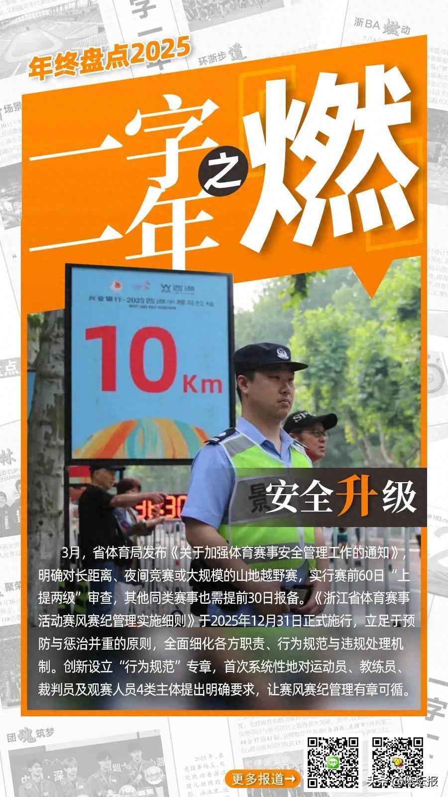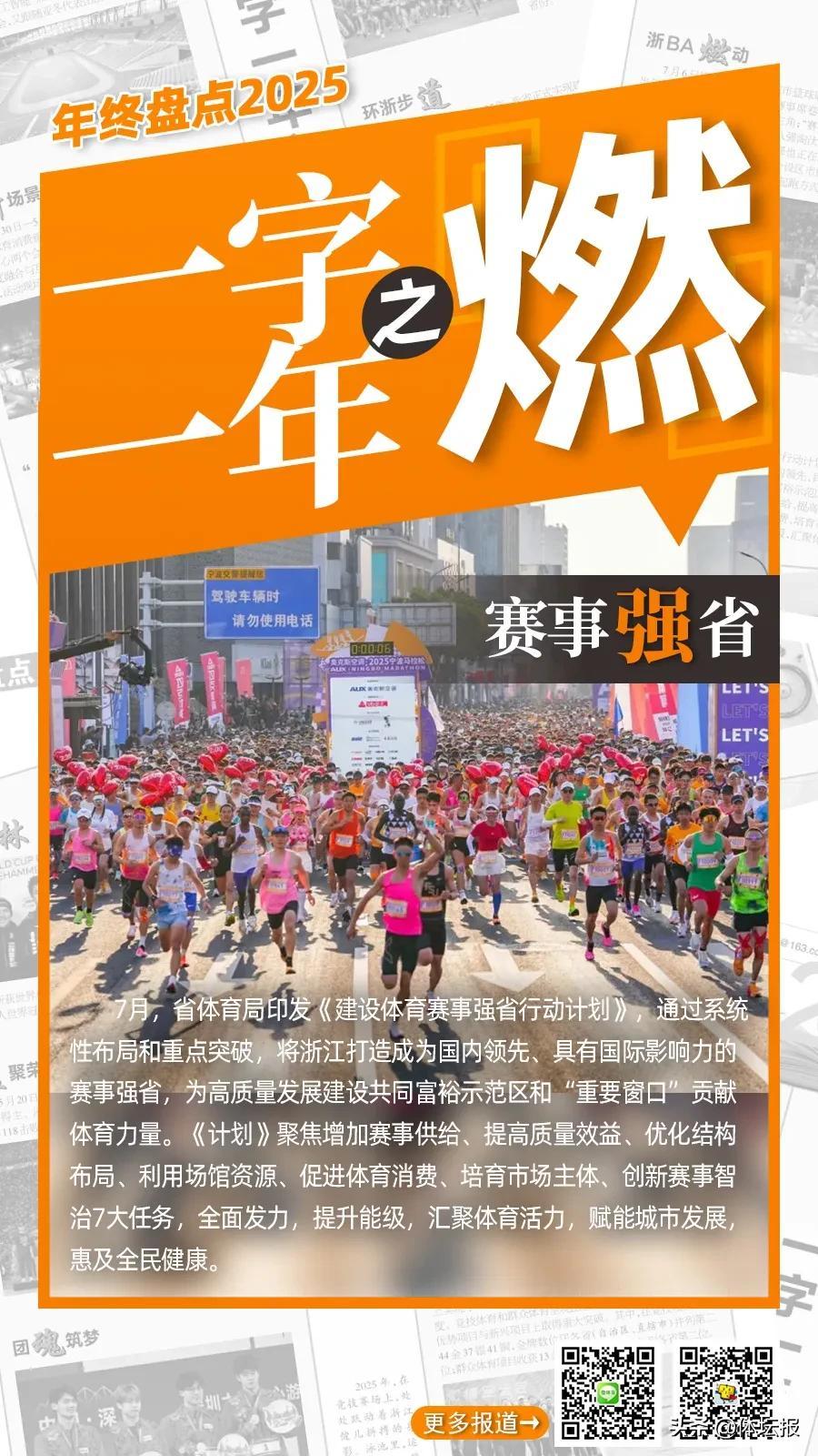 燃——賽事盛火點燃全民激情,釋放體育灼灼熱能。賽事升級、國際接軌,頂級賽會爭相落地;政策夯基、規則護航,強省藍圖系統鋪展;全民燃動、草根登場,體育活力深度賦能——2025年的浙江體育,正匯聚成一股賽事能級躍升、體系構建完善、全民參與湧動的磅礴之勢。