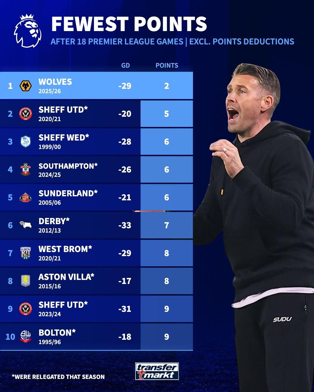 此前根據德轉數據,在第18輪時,狼隊已經創造了英超球隊前18輪的最低分紀錄,而這一榜單上所有球隊當賽季最終都降級。