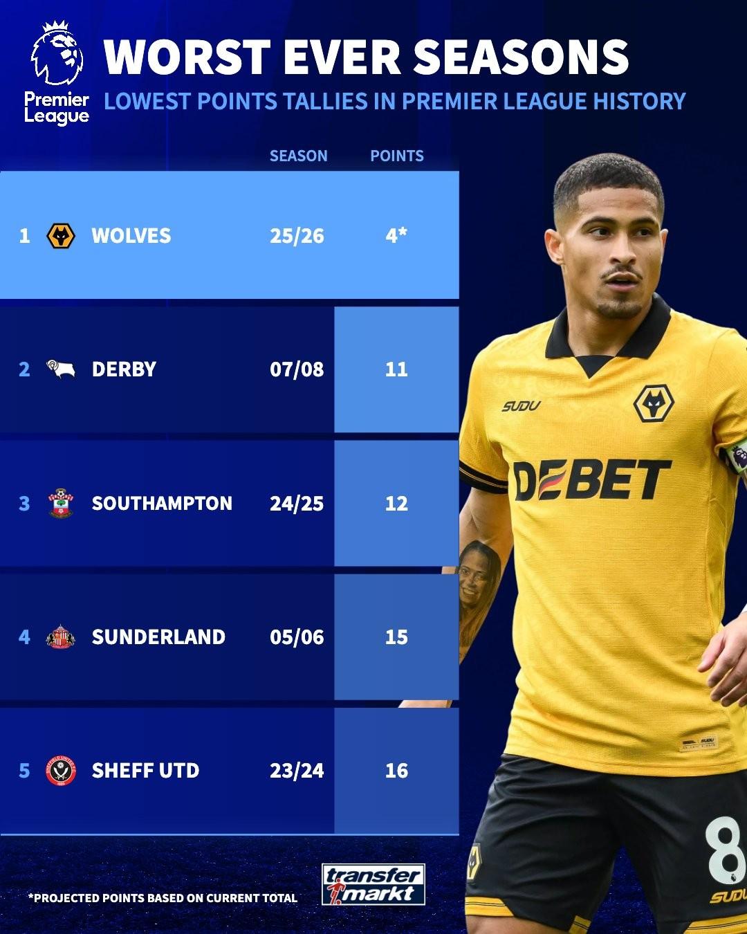 根據德轉的估算,他們認爲狼隊本賽季最終賽季末得分僅有4分。而英超歷史上單賽季最低分得主爲德比郡在2007-08賽季創下的11分。