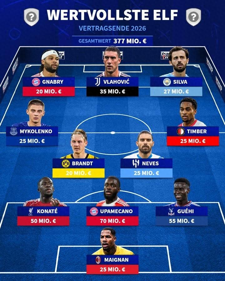 德轉列即將可以與新俱樂部簽約球員最佳陣容(括號內爲球員當前身價):