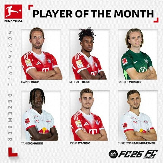 北京時間12月31日,德甲12月最佳球員候選名單公佈,這6名球員爲凱恩、奧利塞、維默爾、迪奧曼德、斯塔尼西奇、鮑姆加特納。