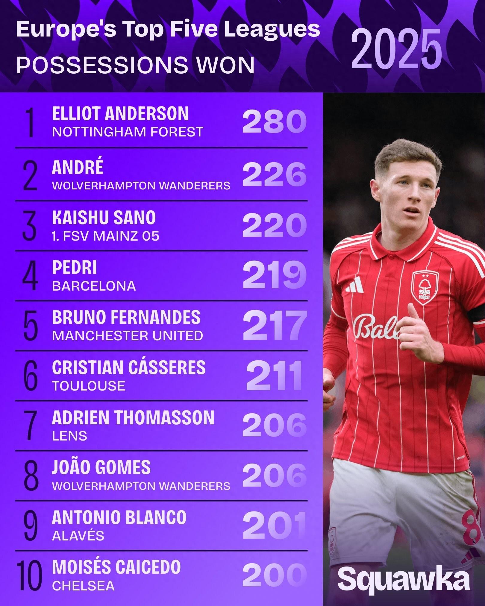 2025五大聯賽奪回球權榜:安德森領跑,佩德里、B費、凱塞多在列