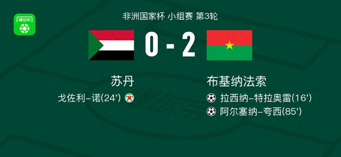 北京時間1月1日非洲國家杯小組賽第3輪,蘇丹迎戰布基納法索。比賽中,斯特凡-阿齊茲-基送出助攻,拉西納-特拉奧雷破門得分,爲球隊取得領先。隨後,戈佐利-諾主罰點球未能命中,錯失扳平良機。臨近比賽結束,丹戈-瓦塔拉送出助攻,阿爾塞納-誇西推射建功,鎖定勝局。最終,蘇丹0-2不敵布基納法索。