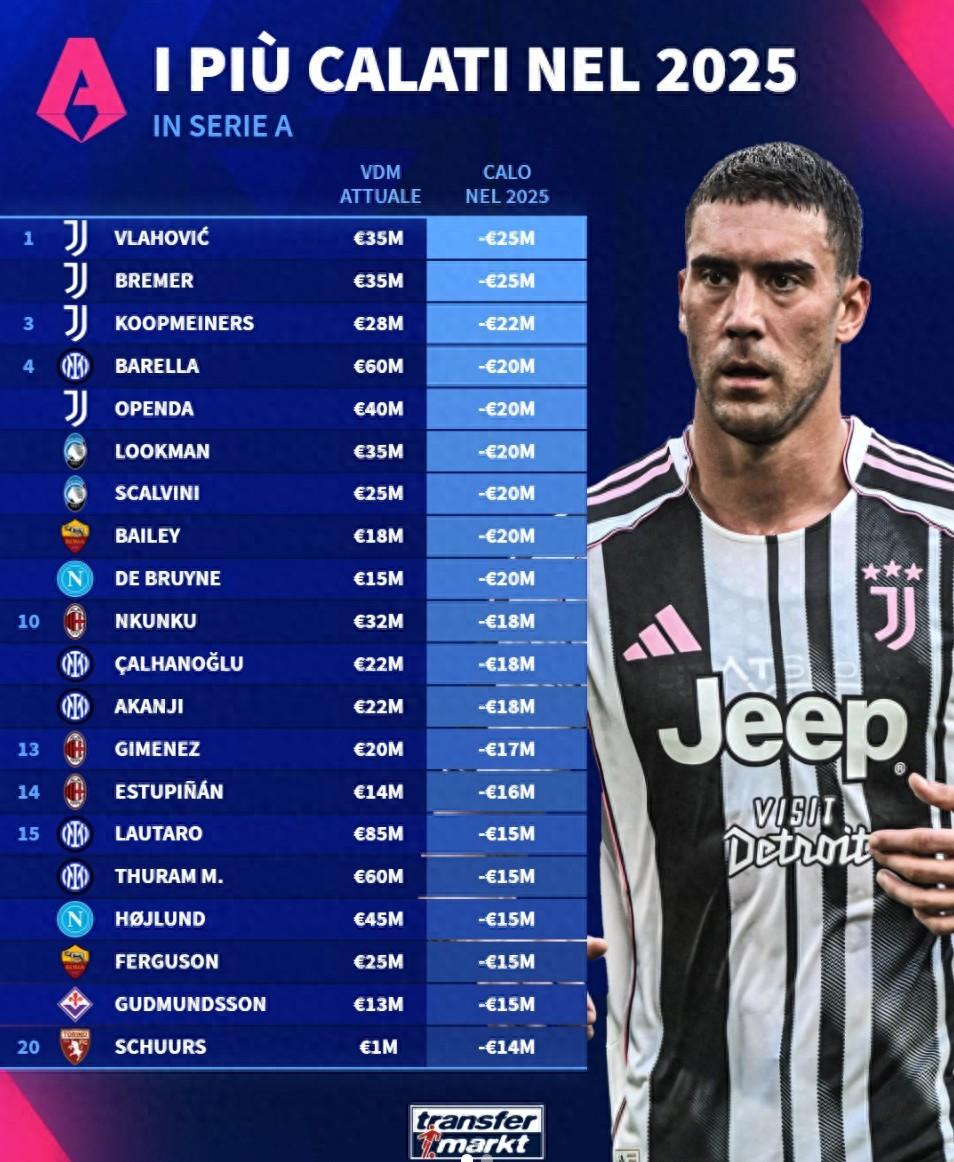 北京時間12月31日,德轉列出了意甲2025年球員身價跌幅榜,尤文圖斯包攬前三,弗拉霍維奇和布雷默下跌2500萬歐元並列第一,庫普梅納斯下跌2200萬歐元第三。