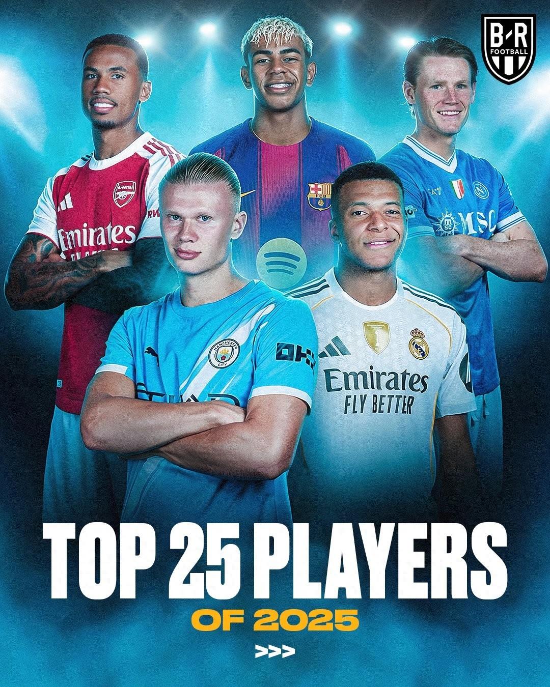 2025年年底,B/R Football評選了2025自然年裏的25大球星,登貝萊居首,姆巴佩、凱恩分列2-3位,亞馬爾排名第7。