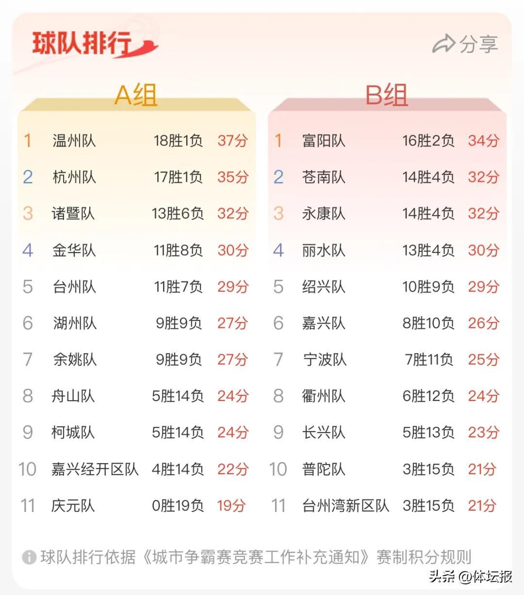 經過前20輪的比拼,A組的溫州隊、杭州隊、諸暨隊,B組富陽隊、蒼南隊、永康隊、麗水隊7支隊伍已成功晉級8強,最後一個席位將在A組台州隊和金華隊中決出。