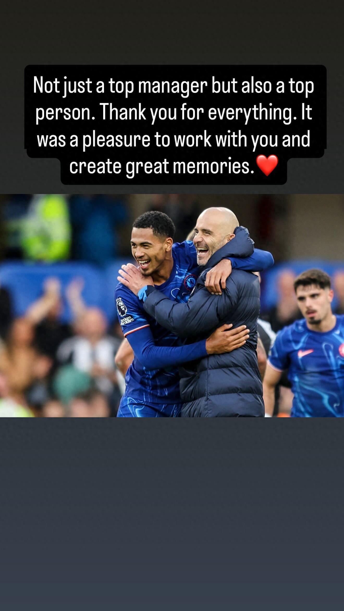 在馬雷斯卡離開切爾西帥位後,科爾威爾在社交媒體告別馬雷斯卡,這位切爾西后衛曬出了一張他和馬雷斯卡擁抱的照片,並寫道:“不僅是一位頂級的主教練,更是一位頂級的人。感謝你所做的一切。能與你共事、一起創造美好的回憶,是一種榮幸。❤️”