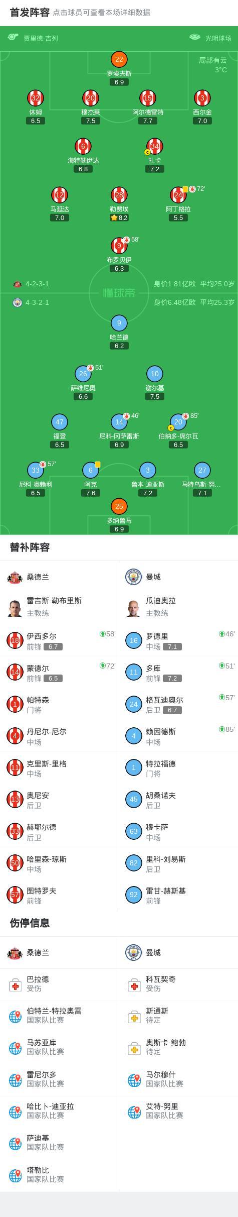 北京時間1月2日英格蘭足球頂級聯賽 聯賽 第19輪,桑德蘭主場對陣曼城。上半場B席破門被吹,多納魯馬撲單刀,哈蘭德抽射造險,下半場薩維尼奧屢失良機,格瓦迪奧爾險破門+中柱。最終比分桑德蘭 0-0 曼城。