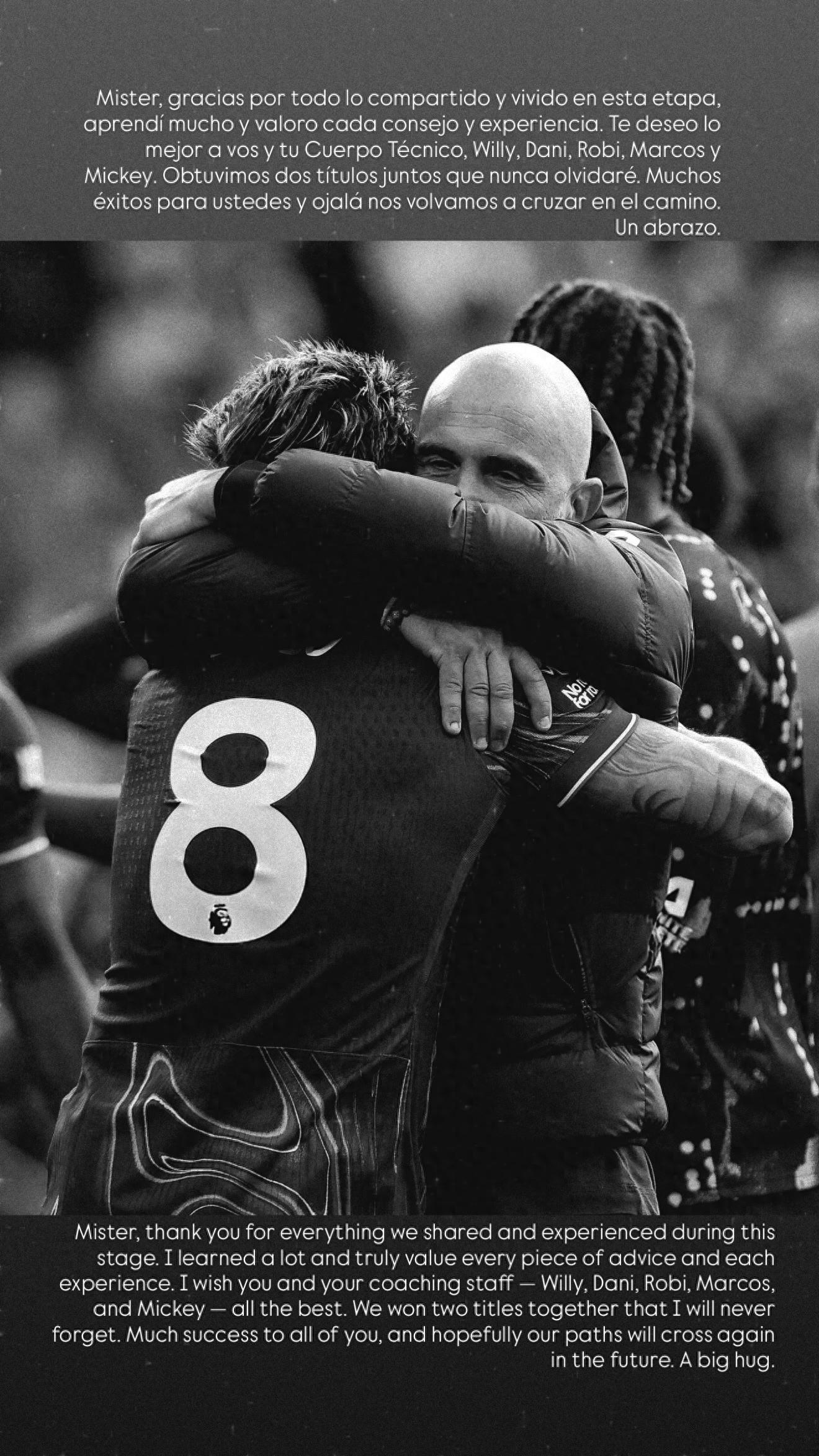 恩佐用西英雙語寫道:“教練,感謝您在這段共事時光裏,與我們一同走過的路、並肩經歷的一切。這段日子,我受益匪淺,也由衷珍視您給予的每一句教誨、每一段經歷。