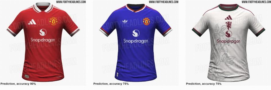 曼聯下賽季客場球衣主色調爲亮眼的皇家藍,並以紅白兩色點綴;第三球衣則採用了米白色設計,帶有大面積的玫瑰印花和居中隊徽。