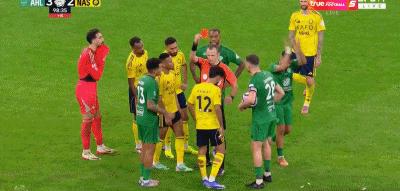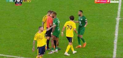 第90+10分鐘,布歇爾放倒阿布沙馬特,裁判出示紅牌將其罰下
