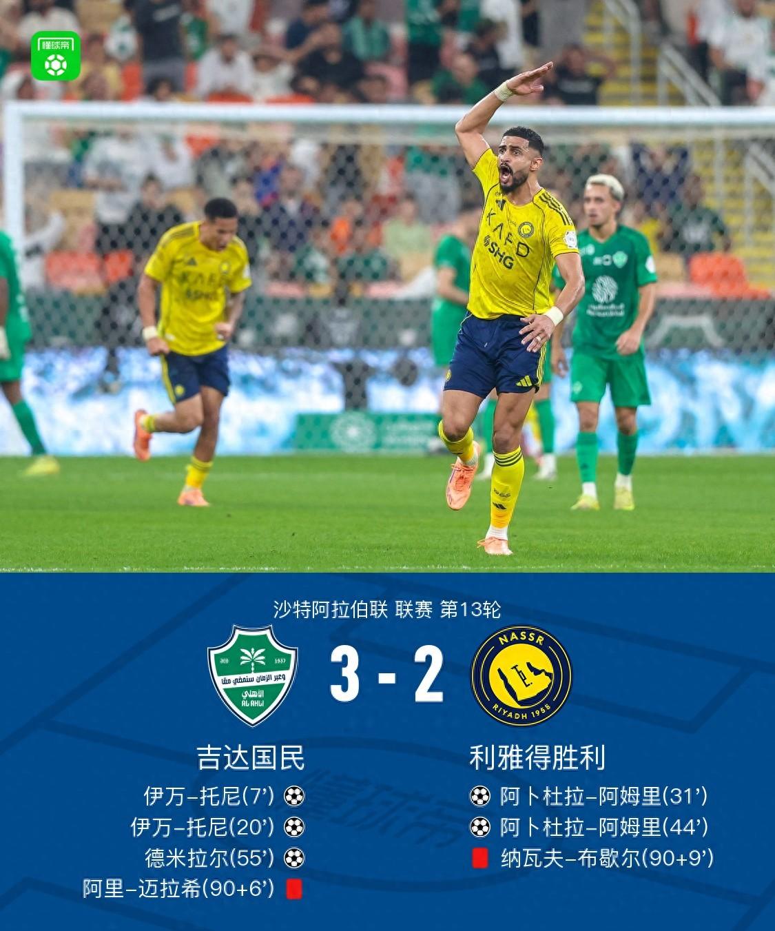 利雅得勝利客場2-3吉達國民,託尼兩射一傳,阿姆裏雙響難救主