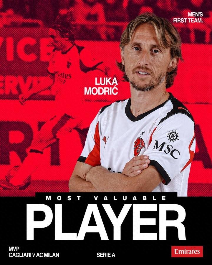 在今天凌晨進行的意甲第18輪比賽中,米蘭客場1-0擊敗卡利亞里,賽後,莫德里奇被米蘭官方評爲本場比賽隊內最佳球員。