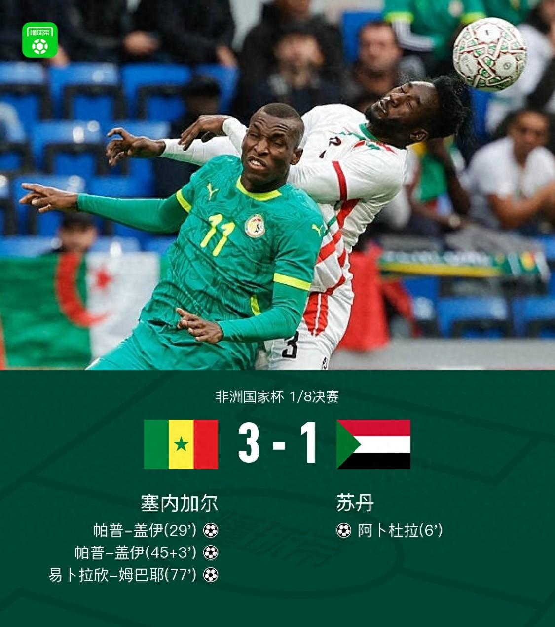 北京時間1月4日,非洲杯1/8決賽,塞內加爾對陣蘇丹。比賽中,阿卜杜拉兜射世界波閃擊,隨後帕普-蓋伊梅開二度,易卜拉欣-姆巴耶建功,馬內助攻雙響。最終,塞內加爾3-1逆轉蘇丹,晉級非洲杯8強。