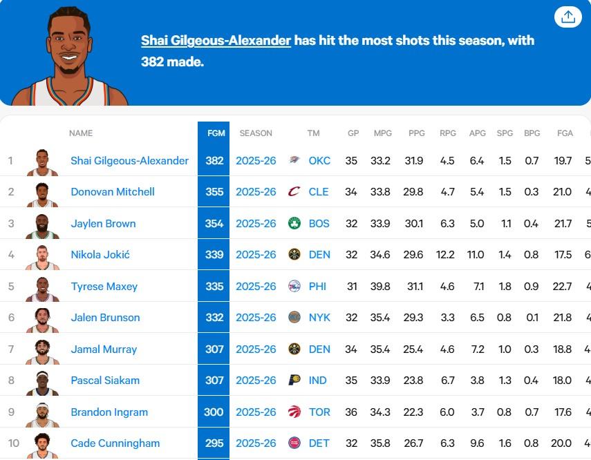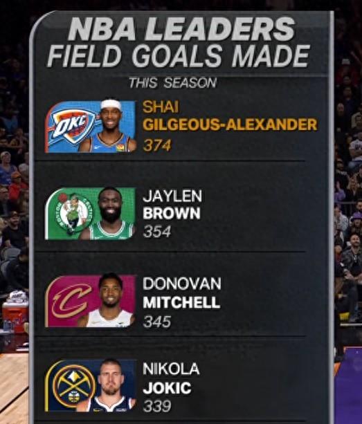 比賽期間,轉播方曬出了一組數據,在本賽季的運動戰投籃命中數方面,雷霆隊當家球星亞歷山大高居榜首。