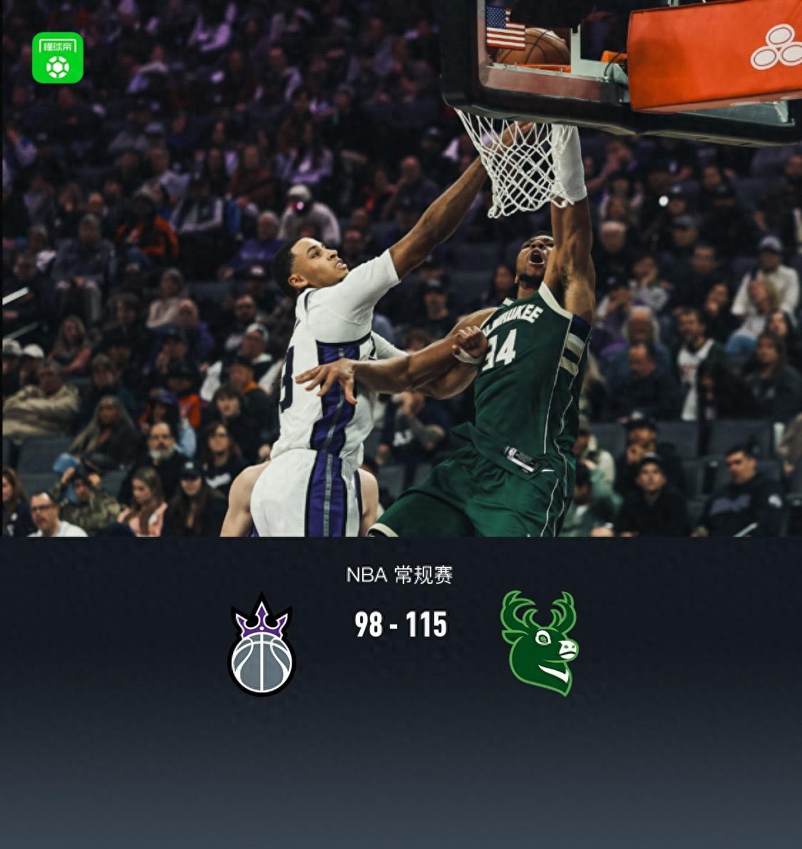 北京時間1月5日NBA 常規賽,薩克拉門託國王對陣密爾沃基雄鹿。半場國王44-62雄鹿,最終國王98-115雄鹿。