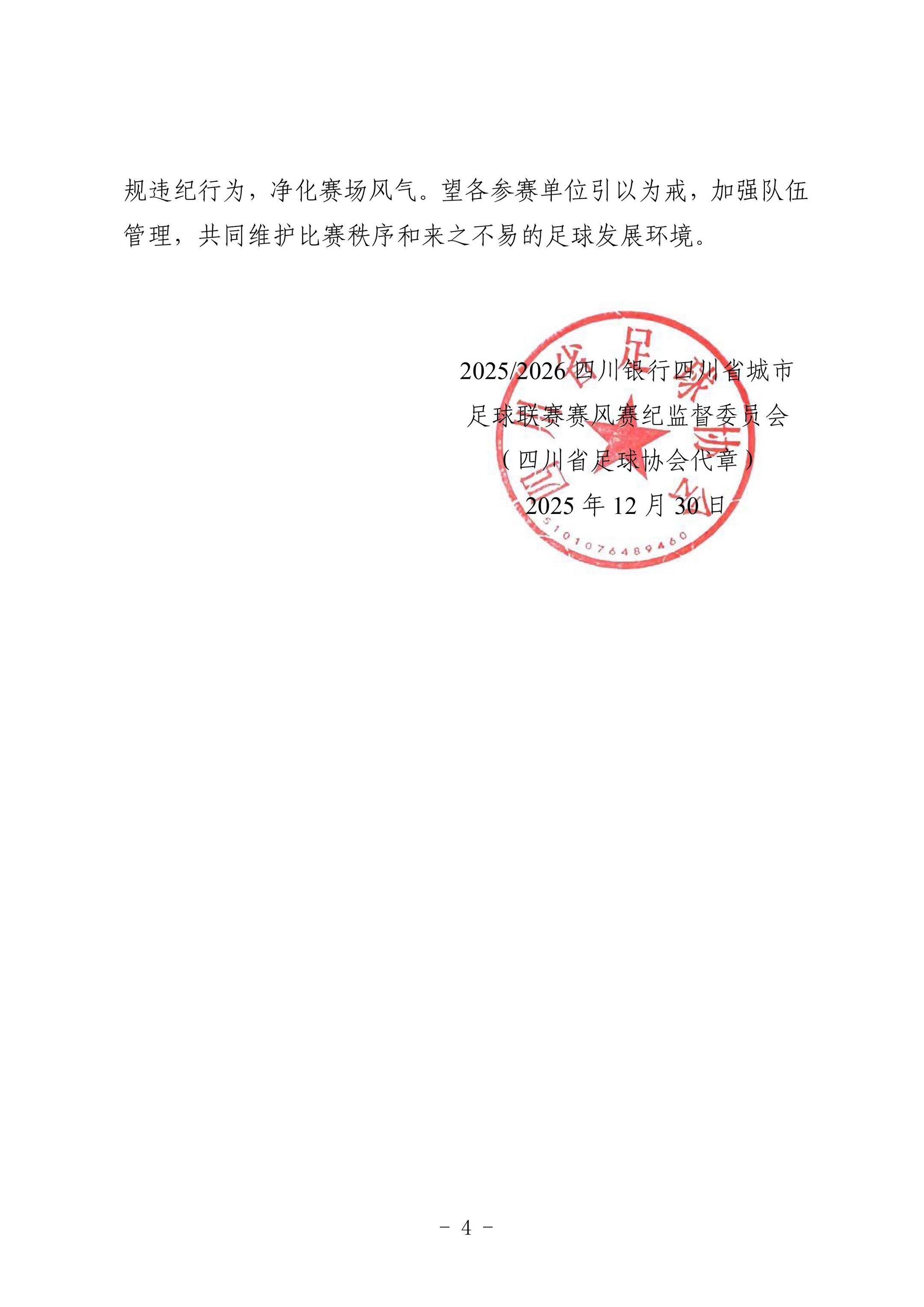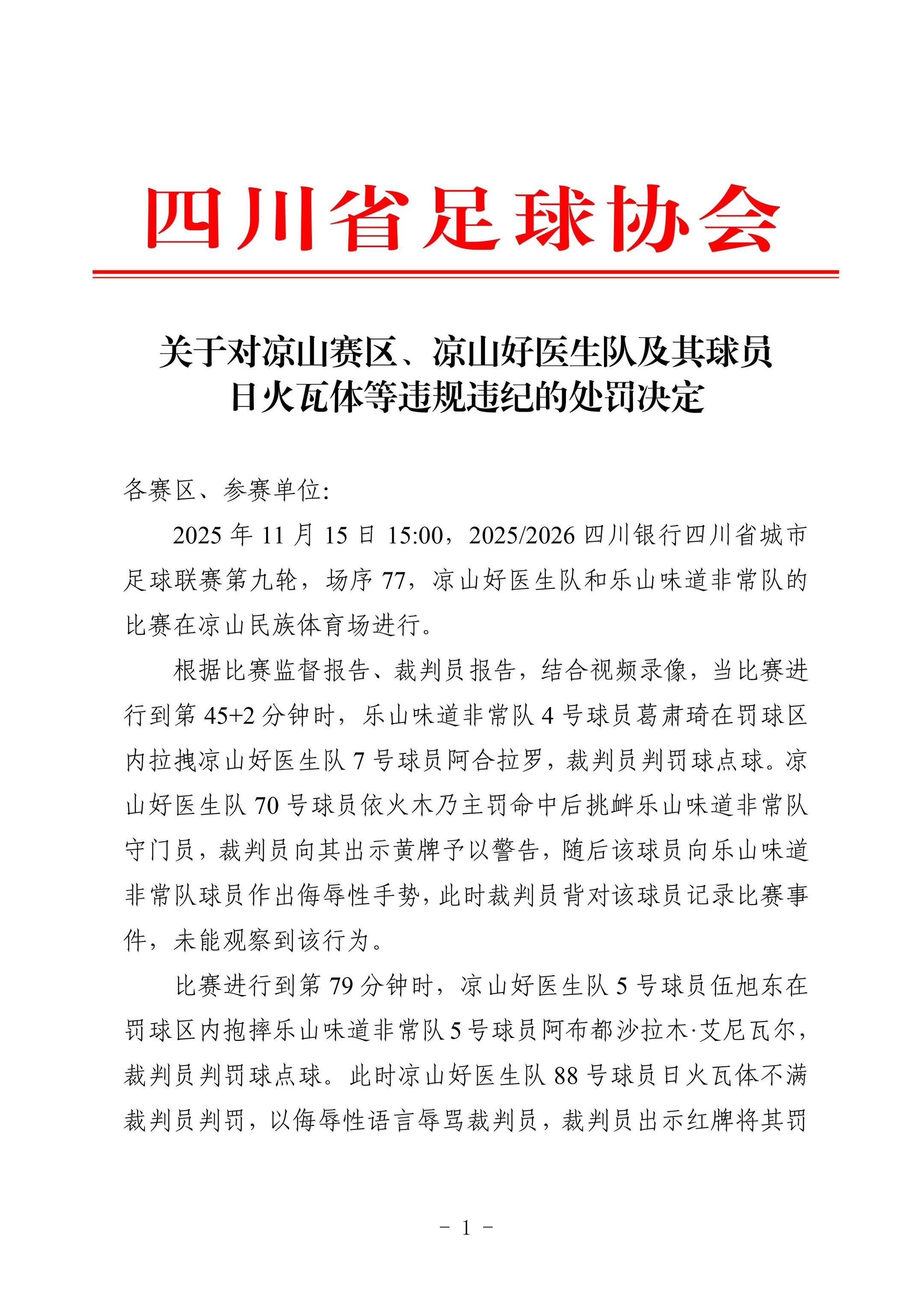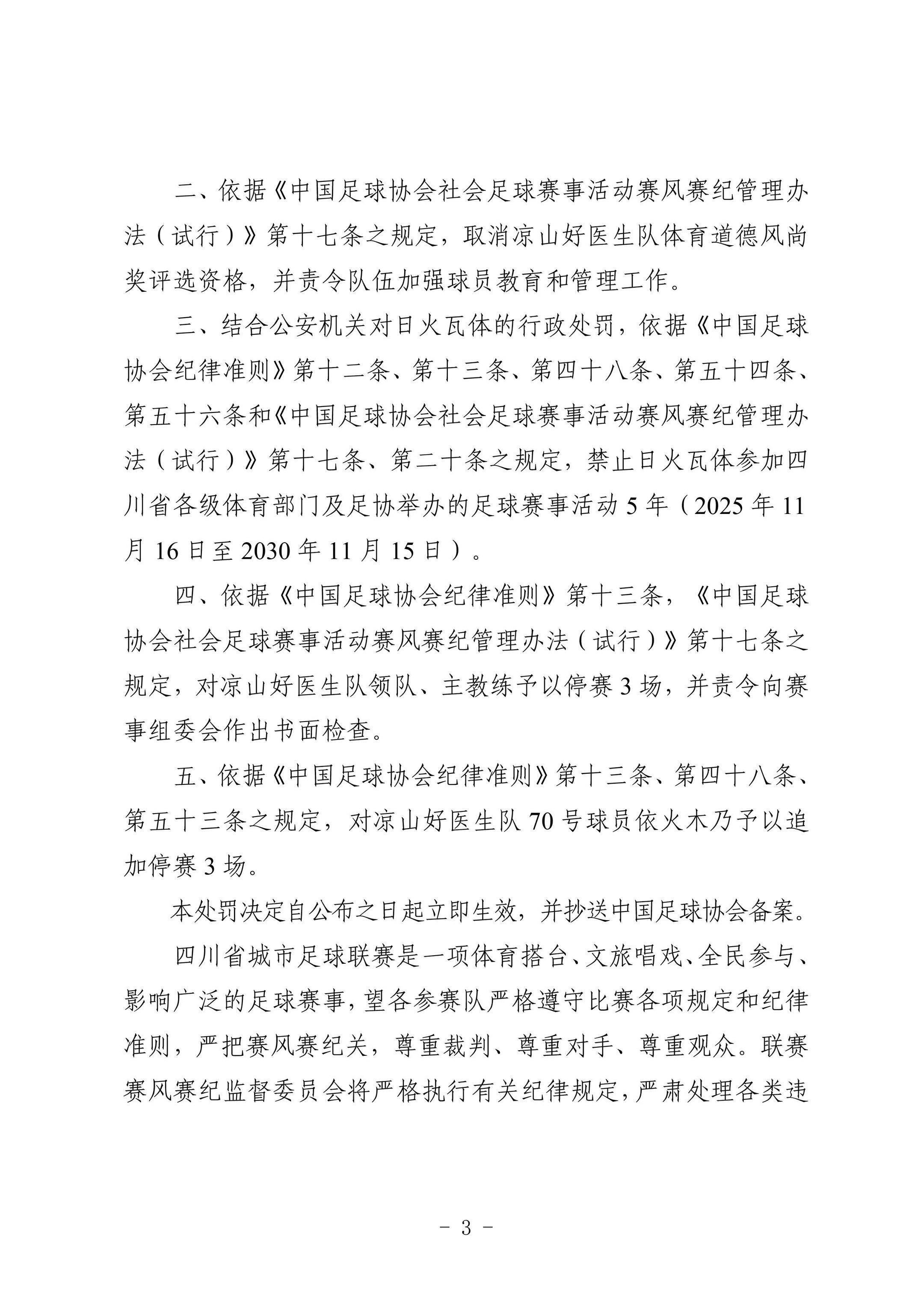 1月5日,四川省足球協會官方宣佈,川超涼山隊的球員日火瓦體因此前在比賽結束後有毆打裁判的行爲,被處以5年禁賽。此外涼山賽區和涼山隊其他人也有被處罰的情況。