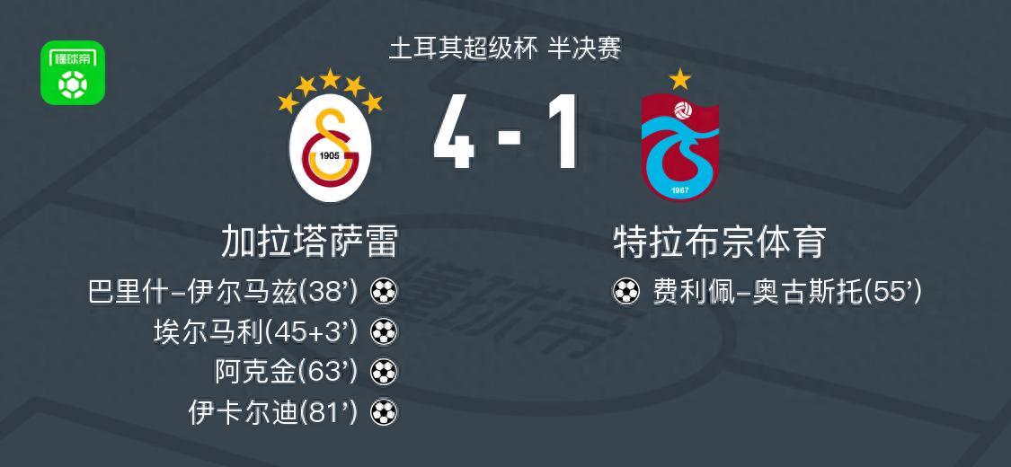 北京時間1月6日,土耳其超級盃半決賽展開較量,加拉塔薩雷與特拉布宗體育展開對決。比賽中,羅蘭-紹洛伊送出助攻,巴里什-伊爾馬茲接球后完成破門,爲球隊先拔頭籌。隨後,伊卡爾迪精準傳球找到埃爾馬利,後者成功擴大比分。上半場結束前,特拉布宗體育由費利佩-奧古斯托接奧萊貝助攻攻入一球,縮小分差。下半場,薩內送出關鍵傳球,阿克金把握機會建功。比賽尾聲階段,卡拉塔什助攻伊卡爾迪破門,鎖定勝局。最終,加拉塔薩雷以4比1戰勝特拉布宗體育,順利晉級下一輪。