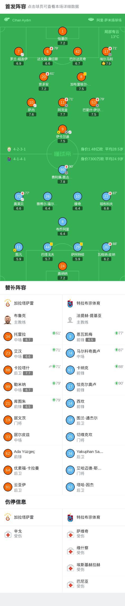 加拉塔薩雷4-1大勝特拉布宗體育,伊卡爾迪1傳1射,阿克金破門