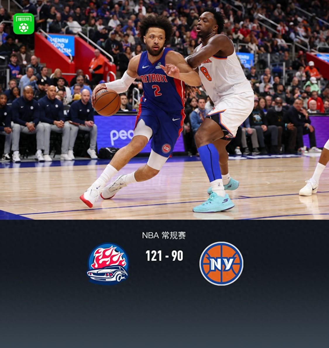 北京時間1月6日NBA 常規賽,東部第一第二大戰中,底特律活塞對陣紐約尼克斯。半場活塞64-54尼克斯,最終活塞121-90尼克斯。底特律活塞坎寧安29分3板13助,賈文特-格林17分2板1助;紐約尼克斯布倫森25分3板,麥克布萊德17分2板2助。
