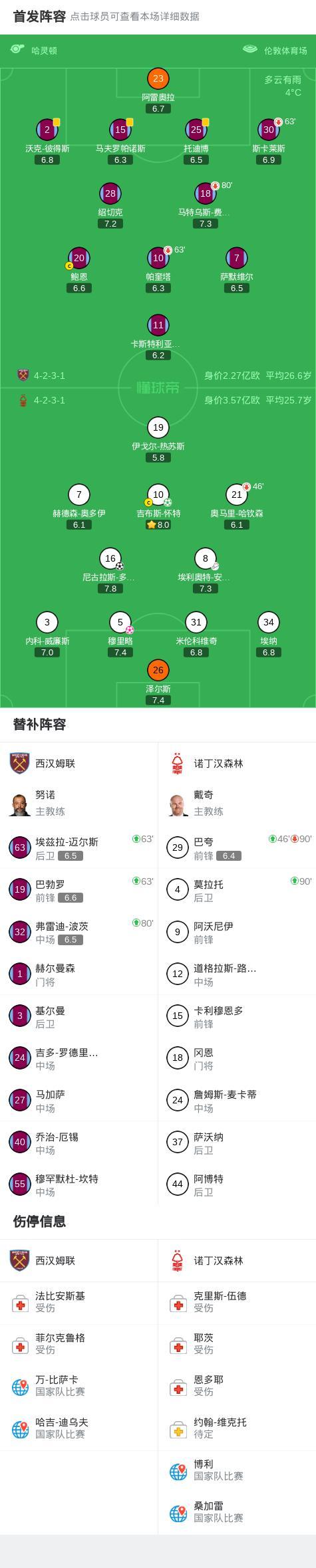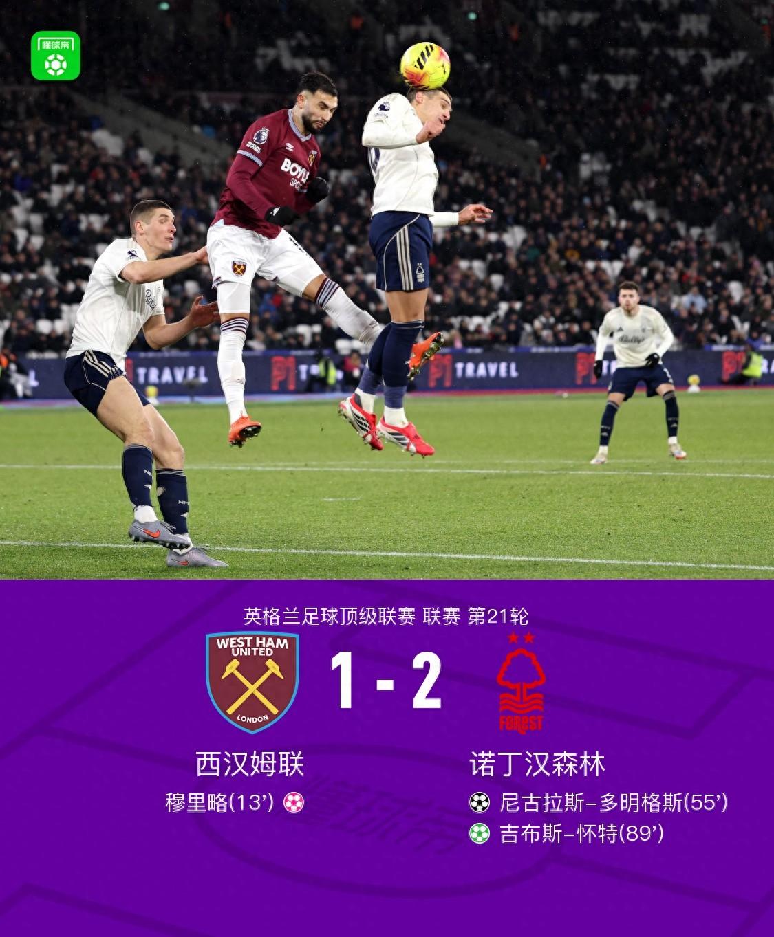 諾丁漢森林2-1逆轉西漢姆聯,多明格斯破門,吉布斯-懷特點射,穆裏略烏龍