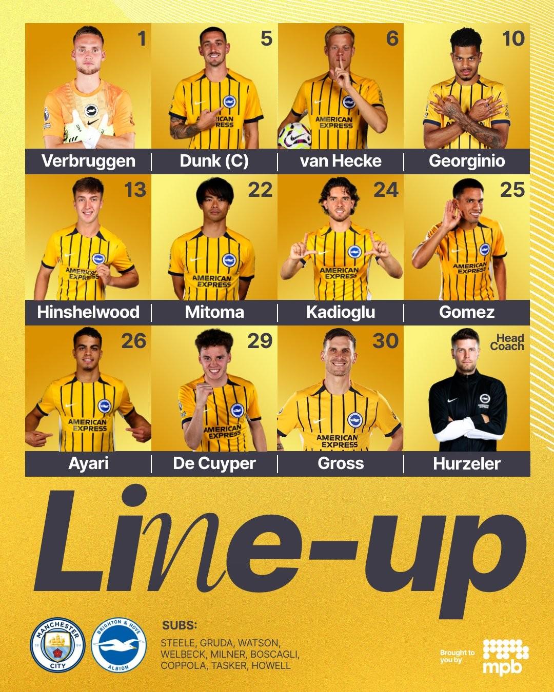 布萊頓首發:1-巴爾特-費布魯亨、24-卡迪奧盧、5-鄧克、6-範黑克、29-德克伊珀、10-呂特、13-傑克-欣謝爾伍德、25-迭戈-戈麥斯、26-亞辛-阿亞里、22-三笘薰、30-格羅斯