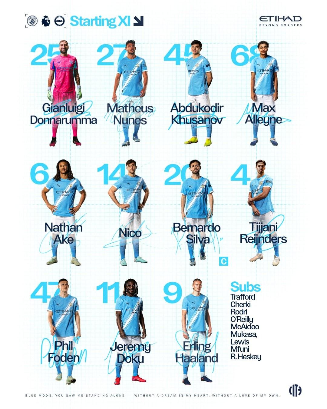 曼城首發:25-多納魯馬、27-馬特烏斯-努內斯、45-胡桑諾夫、68-阿萊恩、6-阿克、14-尼科-岡薩雷斯、20-伯納多-席爾瓦、4-賴因德斯、47-福登、11-多庫、9-哈蘭德
