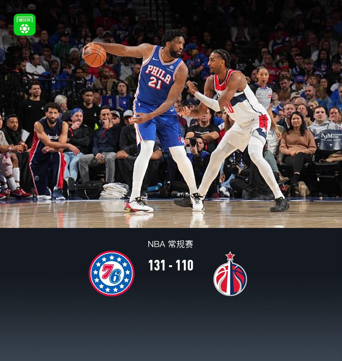 第四節76人格雷姆斯拿下14分,奇才卡林頓拿下6分,最終76人131-110戰勝奇才
