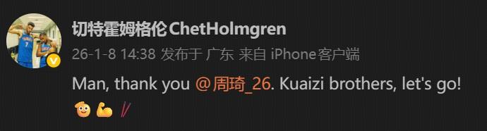 北京時間1月8日,雷霆球員切特-霍姆格倫在微博發了視頻,感謝了北京北汽球員周琦爲自己的全明星拉票。