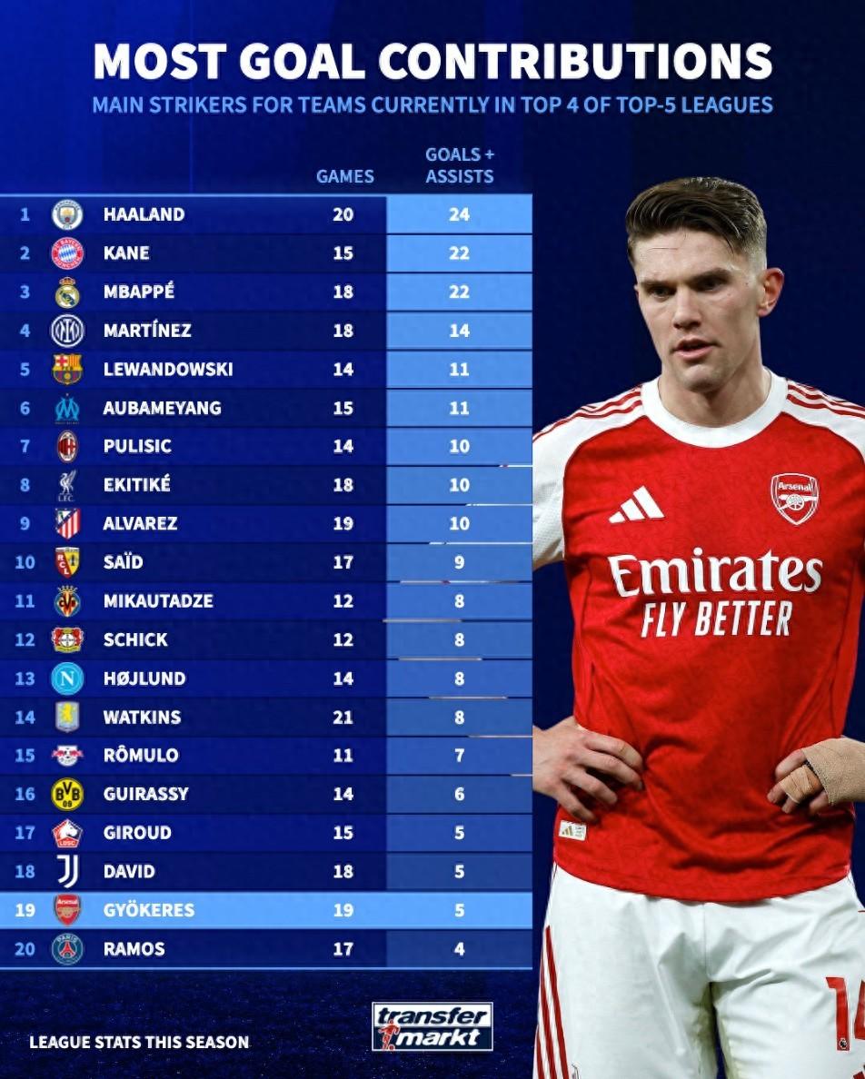 北京時間1月9日,德轉統計出了目前歐洲五大聯賽排名前四的球隊中各自隊內第一前鋒的直接參與進球數排行榜,曼城的哈蘭德以24球排名第一,而阿森納的哲凱賴什則以5球排名倒數第二。