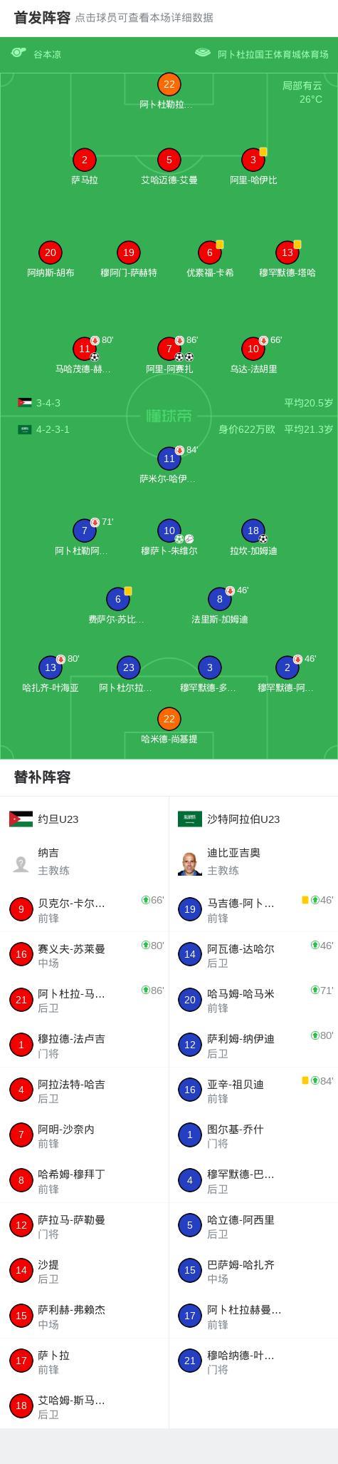 第19分鐘,沙特阿拉伯U23球員穆薩卜-朱維爾助攻拉坎-加姆迪打入一球。