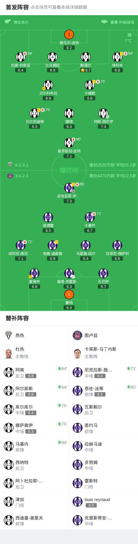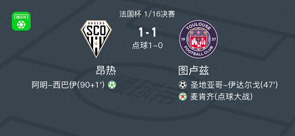 北京時間1月10日法國杯 1/16決賽,昂熱對陣圖盧茲。昂熱阿明-西巴伊破門。圖盧茲聖地亞哥-伊達爾戈破門。最終比分昂熱 2-1 圖盧茲。