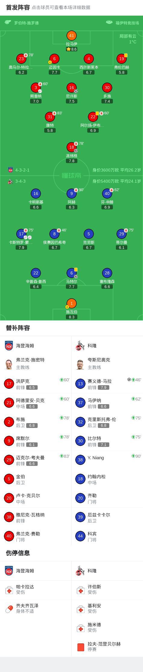 北京時間1月10日德國足球頂級聯賽 聯賽 第16輪,海登海姆主場對陣科隆。海登海姆派林格破門,尼許斯破門。科隆馬特爾破門,賽義德-馬拉破門。最終比分海登海姆 2-2 科隆。