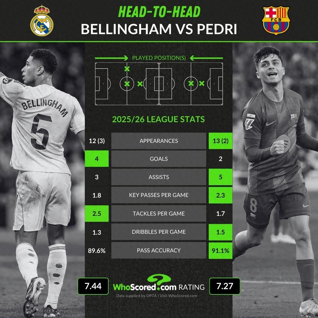 WhoScored統計貝林厄姆和佩德里本賽季至今西甲數據: