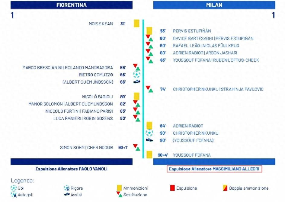 米蘭在意甲第20輪客場1-1戰平佛羅倫薩,賽後的裁判報告顯示主教練阿萊格里在這場比賽當中還被裁判驅逐出場。