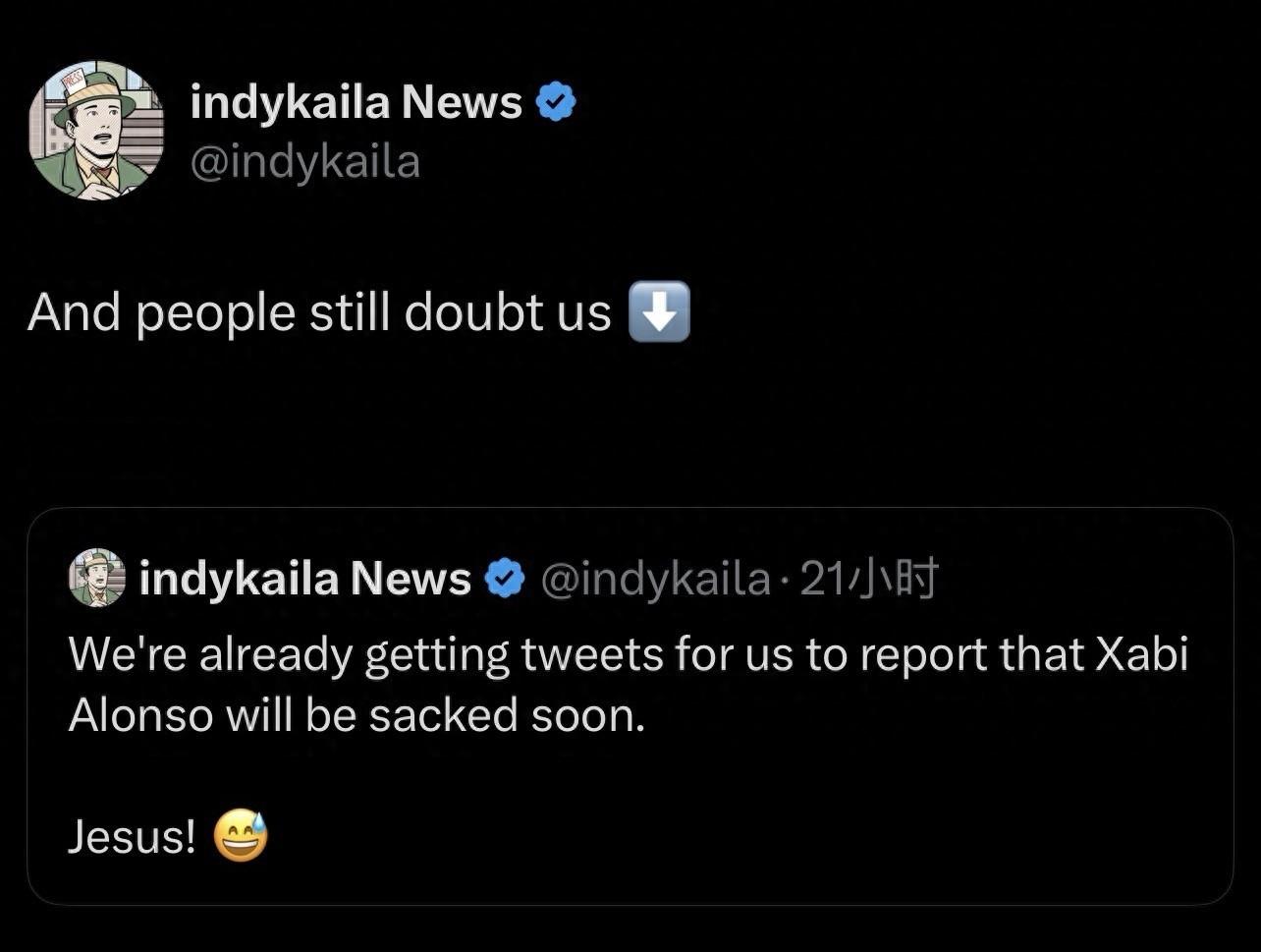 在皇馬正式公告發布的約20小時前,綠帽哥發佈了一則消息,表示:“我們收到一些消息,要求我們報道阿隆索即將被解僱的消息,我的天啊!”