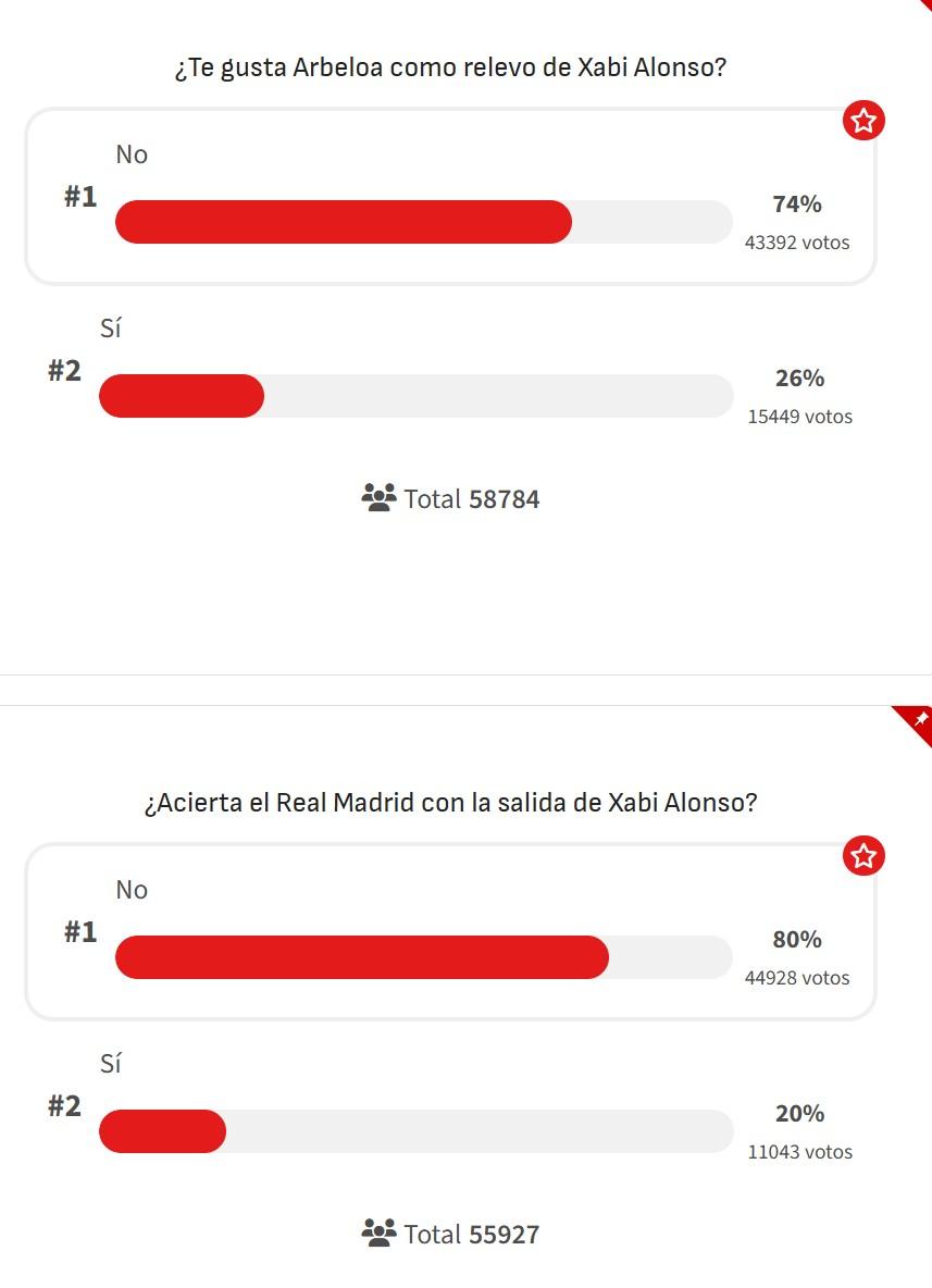 近日,皇馬官網宣佈阿隆索離任,並由卡斯蒂亞主帥阿韋洛亞接替。西班牙媒體《阿斯報》隨後發起的球迷投票統計顯示,截至目前約80%的球迷認爲皇馬解僱阿隆索是錯誤的決定。
