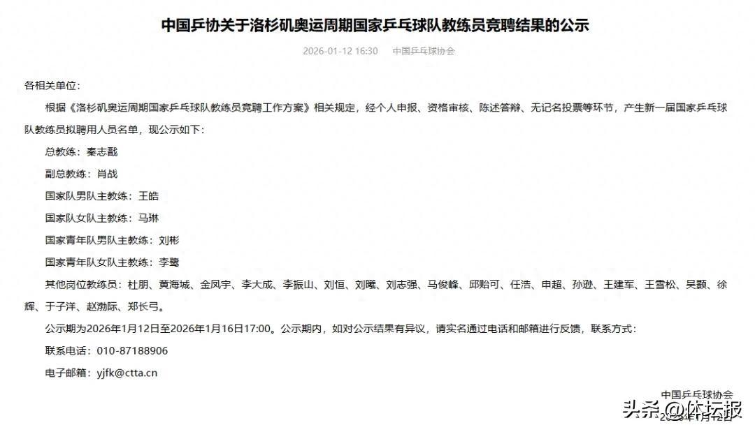 1月12日,中國乒乓球協會官網發佈中國乒協關於洛杉磯奧運週期國家乒乓球隊教練員競聘結果的公示。