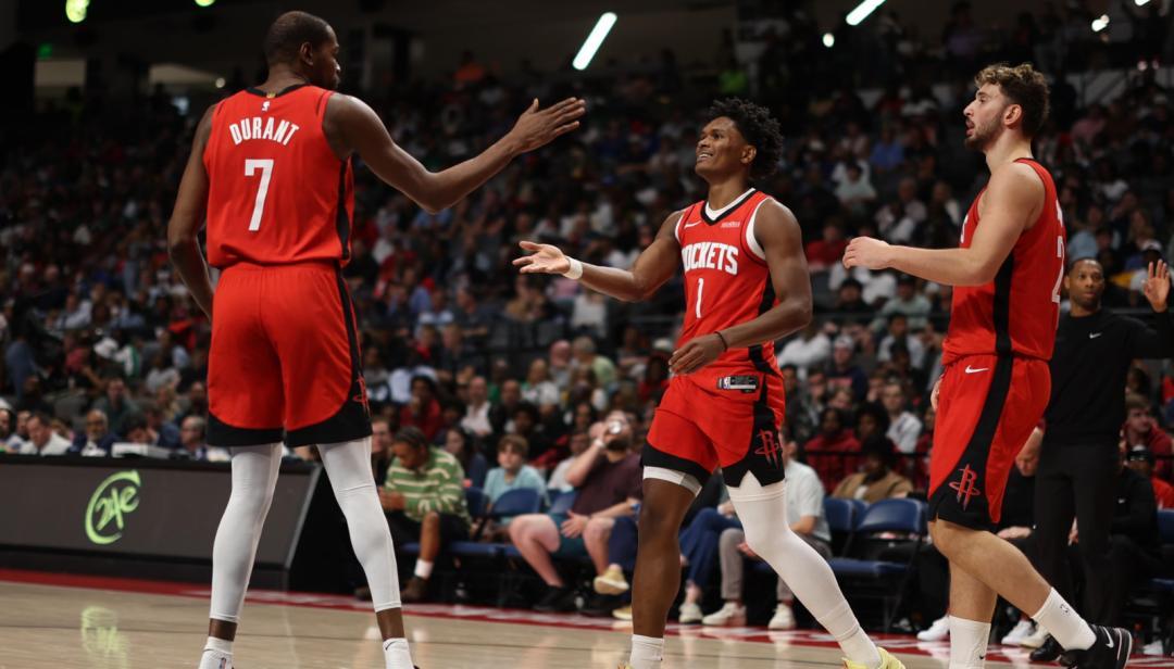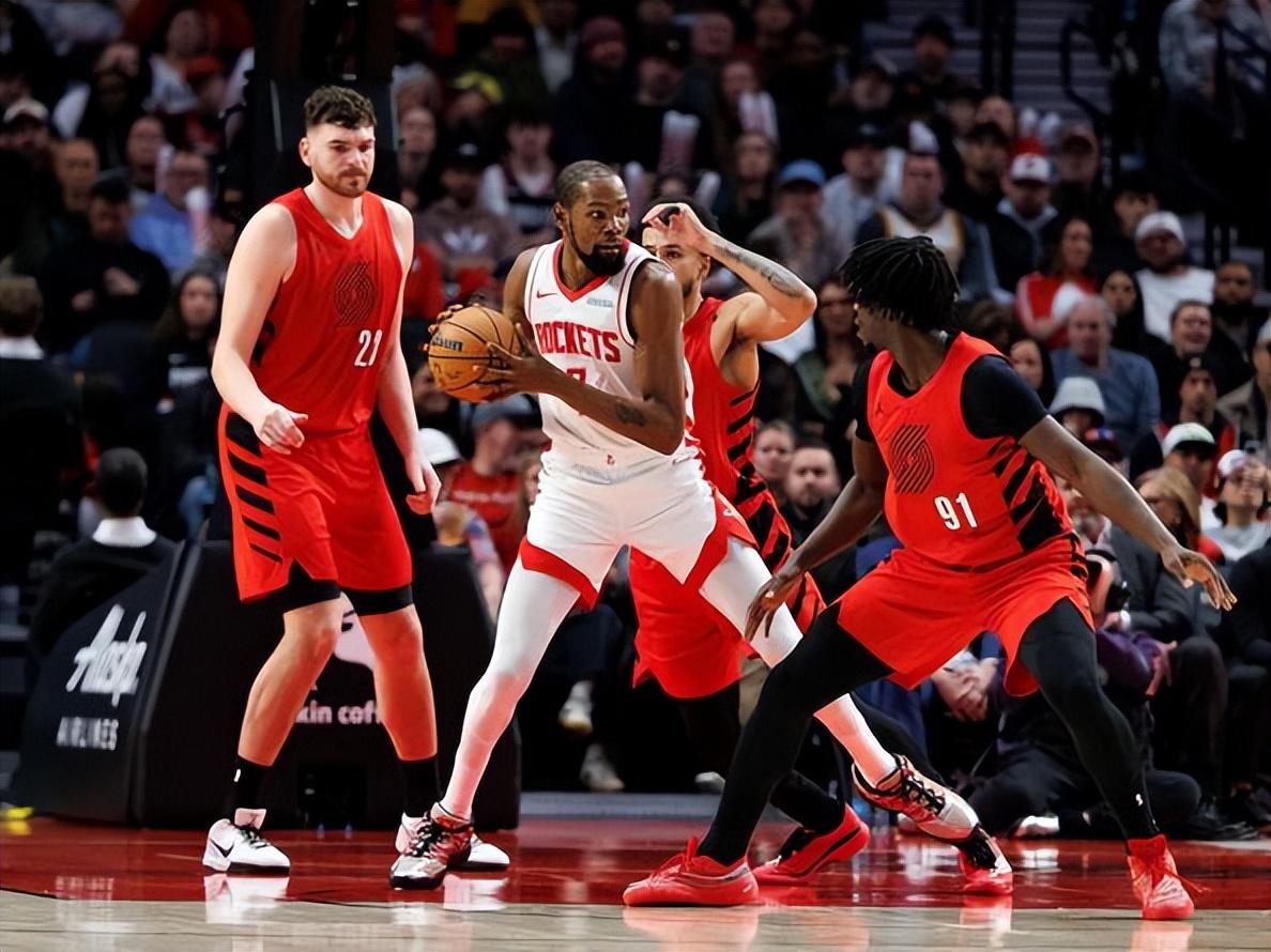 是杜蘭特不行了嗎?就我們觀察來看,似乎也不是這樣。在賽季早期的比賽中,火箭球迷經常抱怨申京在關鍵時刻處理球太多,讓杜蘭特的戰術參與度過低。上週對開拓者的第二場比賽中,申京因傷缺陣,於是開拓者隊更加堅決地派出多名球員夾擊杜蘭特。杜蘭特打得非常理性,他總能在被夾擊時把球傳出來,讓他的隊友獲得了許多不錯的投籃機會,但他們卻一個球都沒投進。