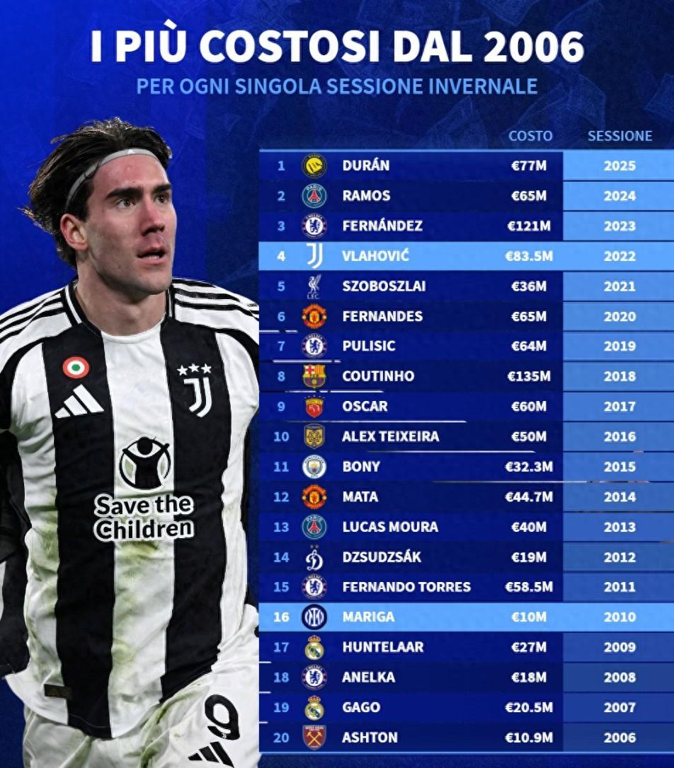 德轉列2006年至2025年全球冬窗標王: