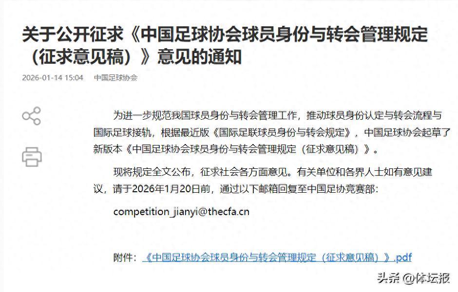 今天,中國足協發佈了新版本的《中國足球協會球員身份與轉會管理規定(徵求意見稿)》,其中新增了過橋轉會規定。