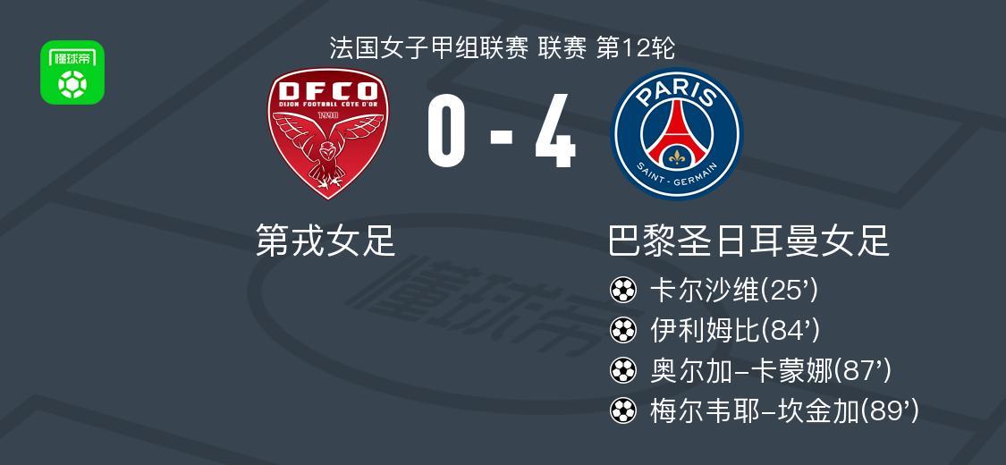 北京時間1月15日法國女子甲組聯賽 聯賽 第12輪,第戎女足主場對陣巴黎聖日耳曼女足。巴黎聖日耳曼女足卡爾沙維破門,伊利姆比破門,奧爾加-卡蒙娜破門,梅爾韋耶-坎金加破門。最終比分第戎女足 0-4 巴黎聖日耳曼女足。