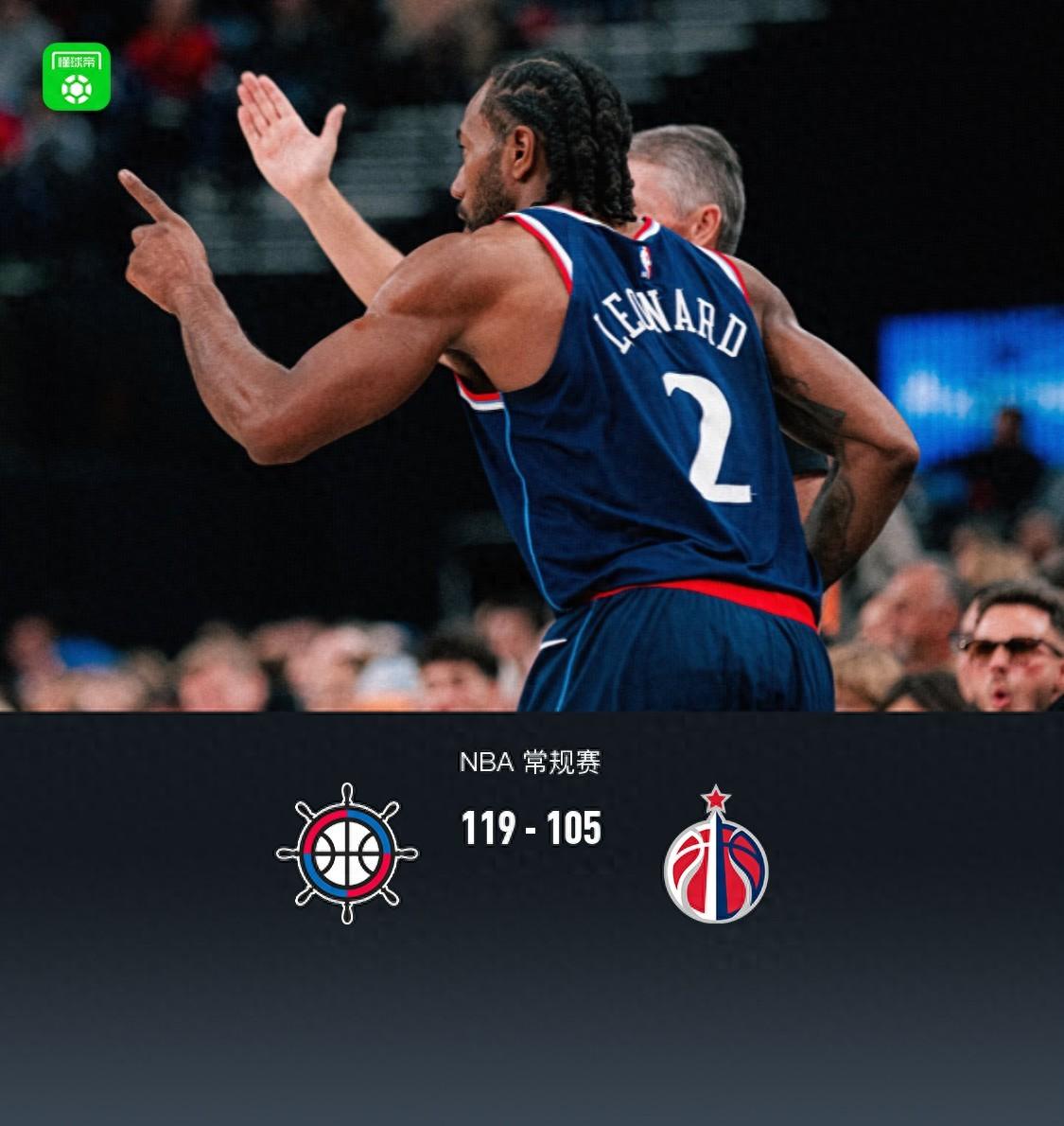 第四節快船倫納德拿下14分,奇才凱肖恩-喬治拿下4分,最終快船119-105戰勝奇才