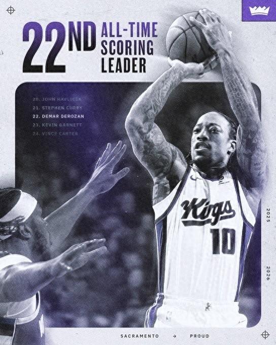 里程碑,德羅贊生涯總得分超越加內特升歷史第22,身前是庫裏