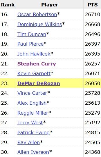 目前排在德羅贊身前的是庫裏,兩人均爲現役。在第20位爲綠軍名宿哈弗裏切克,德羅贊還落後他300多分。