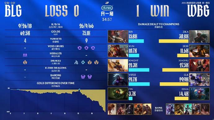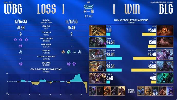 本局雙方互有往來,但在比賽進入30分鐘後,WBG拿到了經濟上的領先,37分鐘關鍵團戰,Xun石頭人開到兩人,Viper厄斐琉斯成功收割,BLG一波結束比賽。