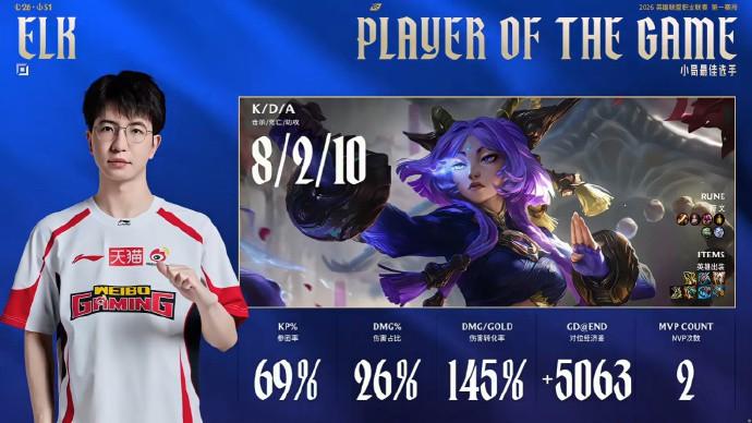 比賽中期,Jiejie皇子開到Viper韋魯斯成功破局,WBG完成團滅後滾起雪球,拿下了第一局比賽的勝利。