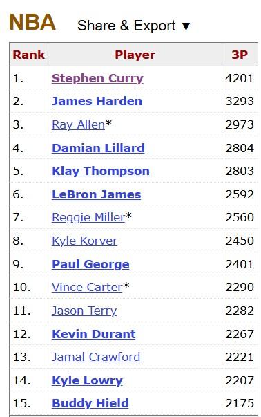 NBA總三分榜前五位
